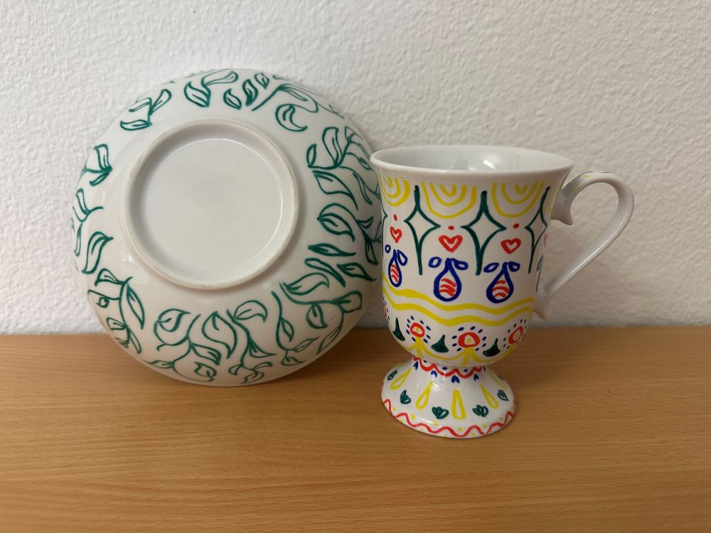 Die Teilnehmerinnen und Teilnehmer können sich verschiedenes Secondhand-Geschirr (Tassen, Gläser, Schüsseln, …) aussuchen und dieses dann nach eigenem Design mit Stiften bemalen. Zuhause kann das eigene Werk dann im Backofen haltbar gemacht werden.